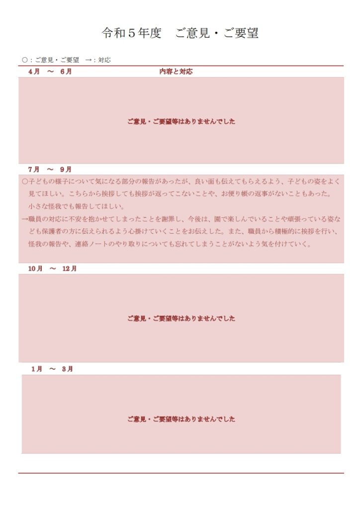 保護者のご意見・ご要望